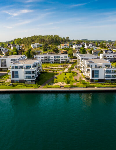 Bilen parkerer du på egen parkeringsplass i prosjektets underliggende garasjeanlegg. Det er også mulighet for å kjøpe båtplass i småbåthavnen rett utenfor.